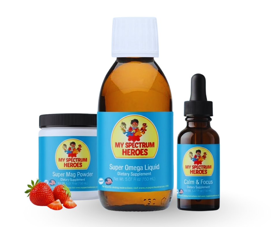 Unlock your child's superpowers with the Cognitive Hero Bundle from My Spectrum Heroes—specially curated to address hyperactivity, restlessness, poor concentration, and mood imbalances common in children with ADHD or ASD. This powerful trio combines Super Mag Powder, Calm & Focus, and Super Omega Liquid for synergistic brain support, backed by scientific research on key ingredients that promote calm focus, neurotransmitter balance, and reduced symptoms without drowsiness.